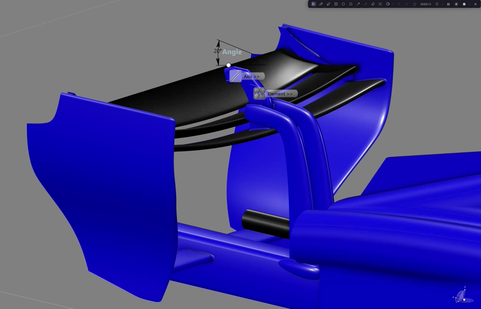 Here I have modelled the proposed 2026 Rear Wing with moveable aerodynamics. The current cars have two wing elements with the rear flap allowed to rotate to reduce downforce on the straights. I have created this model in 3DX from FIA published photos and video. It shows the possibility of rotating the two rearmost elements.