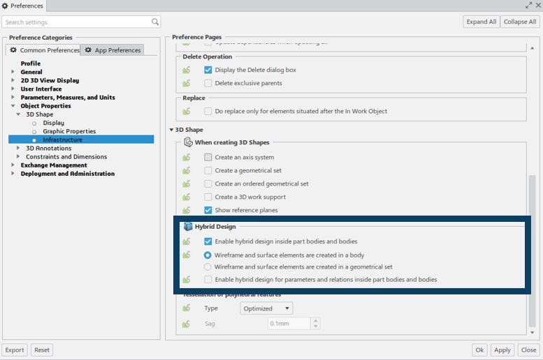 Hybrid Design can be activated/deactivated in Preferences / Common Preferences / Object Properties / 3DShape / Infrastructure