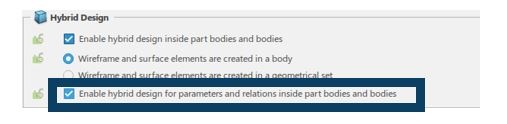 Thanks to a dedicated preference, parameters and relations can be created inside Solid bodies too.