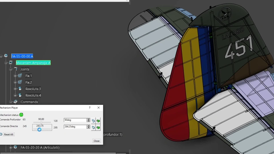 The Fly Again team is enhancing the IAR-80 FA by focusing on the critical role of commands and joints in its control systems. Commands and joints are vital in translating pilot inputs into mechanical actions. By simulating these interactions, the team ensures seamless coordination within the system, preventing issues before they arise. With the rudder command’s 15-degree movement, precision is key. The 3DEXPERIENCE platform has been key in streamlining this process, allowing the team to move from design to simulation, optimizing every aspect of the rudder command system for peak performance.