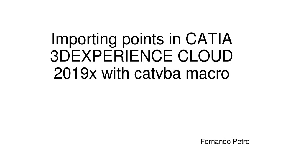 One of the most common tasks in CATIA is to create points coordinates for different purposes. This task can be achieved in different ways in CATIA V5 or CATIA 3DEXPERIENCE.The attached ppt file is a demonstration of what can be done in CATIA 3DEXPERIENCE CLOUD 2019x from this point of vieew. Inside the presentation you will find also the txt file used for demo and the catvba exported from the platform as 3dxml file.