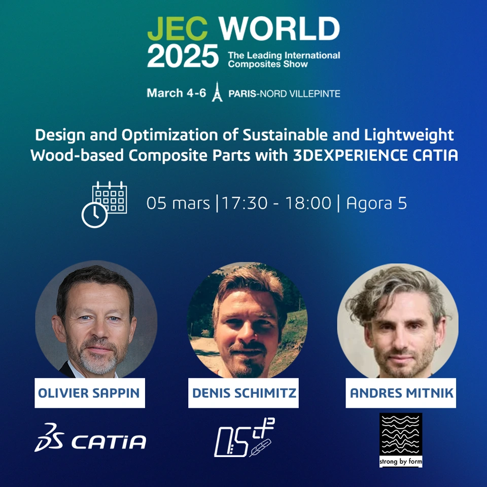 Join Andrés Mitnik, CEO of Strong by Form, Denis Schmitz and Olivier Sappin by CATIA for an inspiring session exploring the strategic potential of a groundbreaking lightweight, wood-based material. Learn how they harness 3DEXPERIENCE CATIA applications and simulation to model and define composite material and evaluate environmental impact—showcased through a compelling demo of this disruptive project.