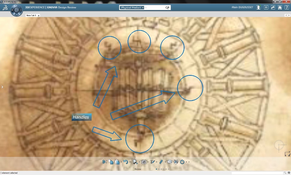 Driving Management System: after thinking about this last 5th handle, looking at some other da Vinci sketches and trying to understand how this ship can be controlled, I have developed a proposal for a driving system simulated in our 3DEXPERIENCE Platform. The idea was to have the main propulsion system rotating around the Z axis of the ship to allow its direction management... thanks to the last handle...