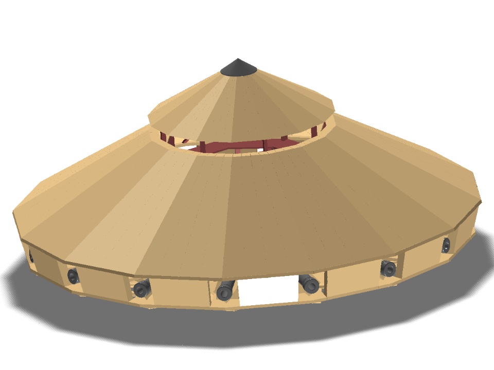 The third dimension... : after having “define” the main bridge of this battleship using the detailed sketch of the folio, I have tried to develop the shape of this boat in the third dimension. Here again, looking at one ”very low detailed” sketch on the folio, I have developed a proposal for this ship based on da Vinci tank concept in which can be retrieved the cannons circular pattern.