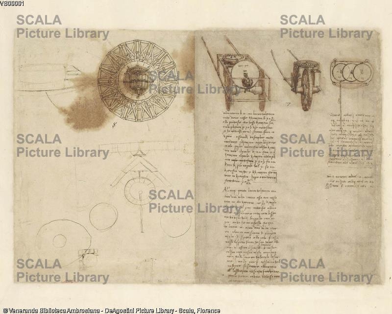 The concept: at first sight, the main sketch can be considered as part of Leonardo’s tank concept, but if you look at the middle, you can easily recognize some wheels with paddles… what leads to think about a ship concept, and maybe a kind of battleship (with 16 cannons aboard...)