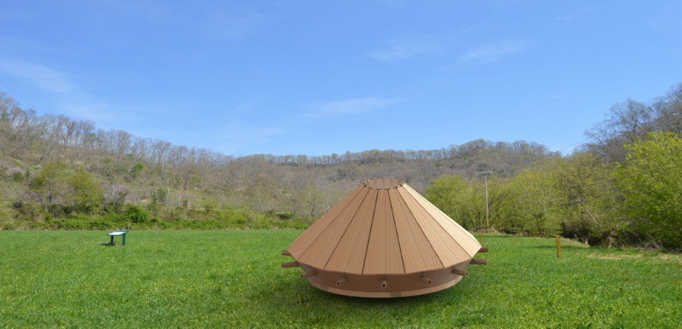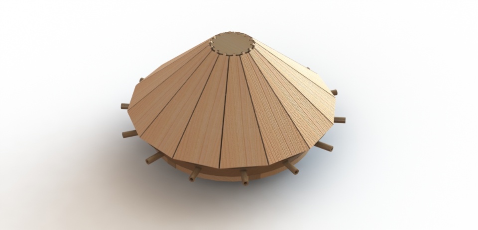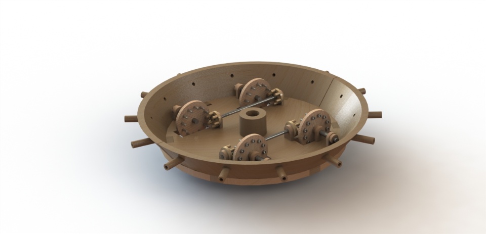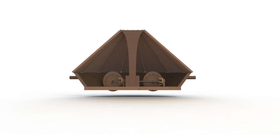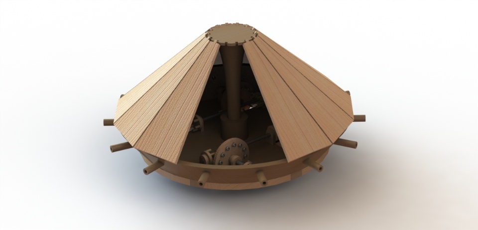 The design features a metal reinforced wooden conical cover, reminiscent of a turtle shell, with slanting angles designed to deflect enemy fire. An array of 16 light cannons would protrude around the perimeter and the vehicle would be propelled by a crank, to be operated by four men.