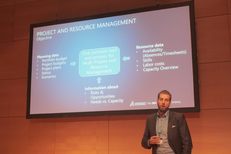 15:20: Sebastian Kress from Dassault Systèmes talks about "Data-driven Portfolio Visualization", about project and resource management. Top-down planning must be complemented by team-based planning from the executive team. With Enovia and Exalead, real-time data can be used to create an up-to-the-minute project plan that can capture input from everyone involved in the process, as opposed to planning that goes from "top" to "bottom" and needs constant adjustment to realities that were previously unknown "above".