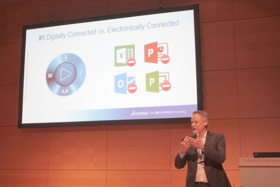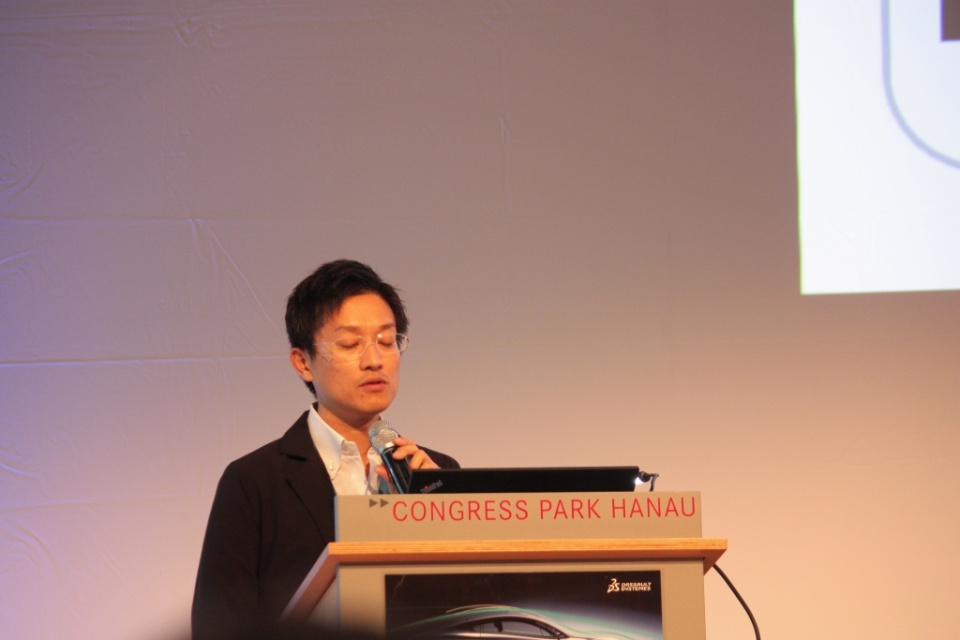 9:50: Brüder-Grimm-Saal A: Instead of the expected lecture by Geberit, I get into the talk by Taiki Furuki from Kubota, whom we met at yesterday's design roundtable. The Japanese agricultural machinery manufacturer worked with 3D-CAD in the design department in the early 90's, but rather badly. After an intermediate phase with design software from another manufacturer, the designers work today together with the designers on the 3DEXPERIENCE platform.