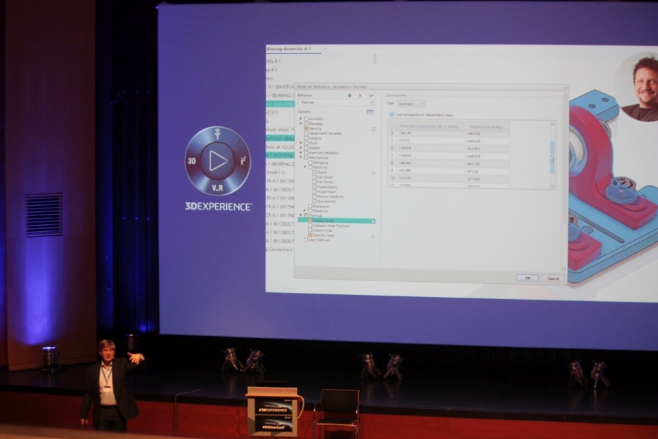 13:30, Paul-Hindemith-Saal: I chose the Materials Track. Andrew Reilly of Granta Design finds drastic words to illustrate his long-standing association with Dassault Systèmes' CAD system: "If you cut away my arm, you can probably read CATIA o the inside." While the CAD user engages in one material only interested in the name and perhaps the density, the "simulators" need much more extensive data, up to the behavior at different temperatures.