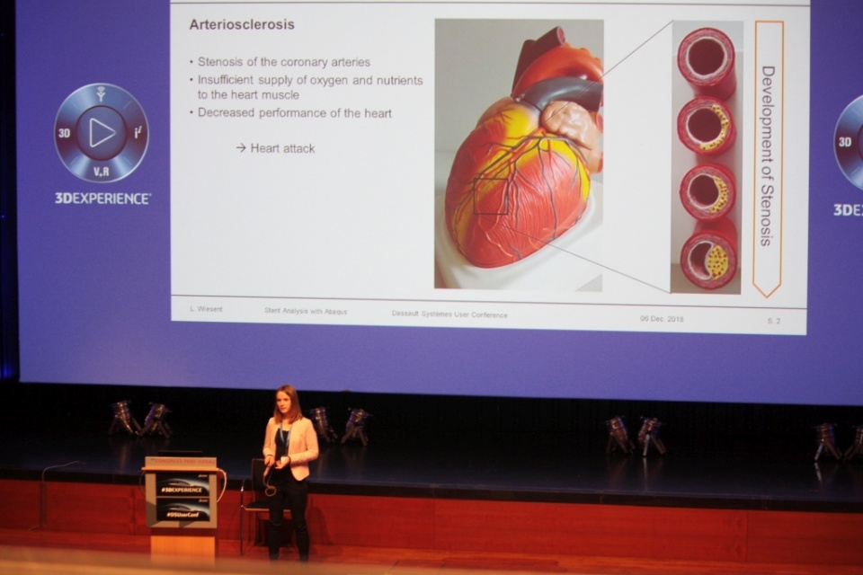 11:35: Lisa Wiesent from the OTH Regensburg reports on the numerical analysis of stents with Abaqus. Stents often deform during insertion - in the course of which they are bent up to the diameter of the vein with a balloon catheter - so that the edges initially lie against the vein wall during expansion, thereby injuring them. Thus, at the site of the stent - which is supposed to eliminate a narrowing of a coronary artery - can form again a proliferation. The aim of Wiesent's research is to expand the stent so that it opens parallel or with edges bent inwards.