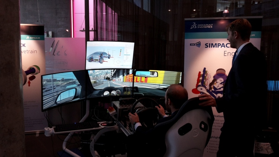 In addition, a driving simulator is set up, in which one can follow the Formula One race track of Monaco. The special feature: the behavior of the vehicle is calculated and controlled in real time via Simpack. For example, a flat tire can be simulated by pressing a button.