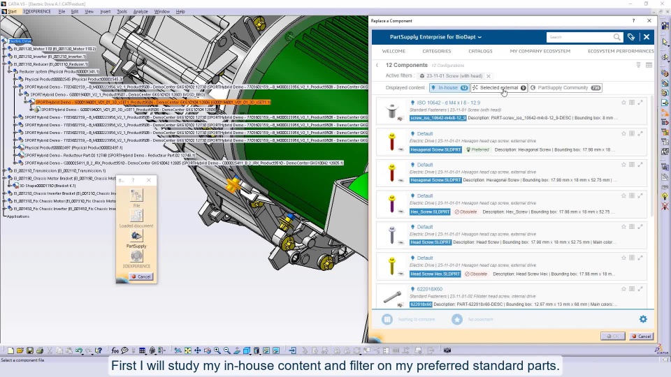 Watch as a CATIA V5 designer finds the right parts, tests them in her 3D design, and replaces them in her electric drive.