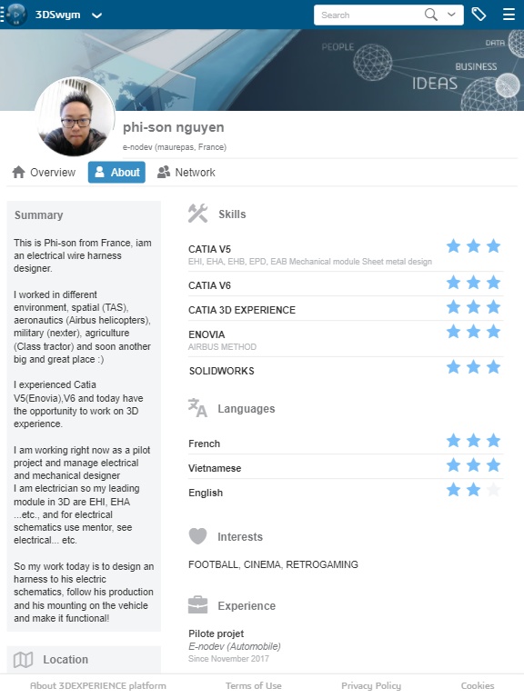 We are delighted to let you know that Phi-son NGUYEN (@PN) has joined the CATIA Champions Program a few weeks ago! Phi-son is an electrical wire harness designer who has worked in different environments like Spatial (TAS), Aeronautics (Airbus helicopters), Military (Nexter), Agriculture (Class tractor). He is an experienced CATIA V5, and 3DEXPERIENCE CATIA User. Phi-son is working right now as a pilot project and manage electrical and mechanical designer. As an electrician, the leading Apps he is using in 3D are EHI and EHA ...His work is to design an harness to his electric schematics, follow his production and his mounting on the vehicle and make it functional.