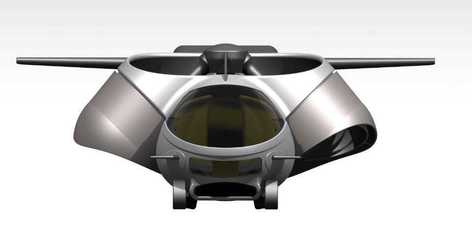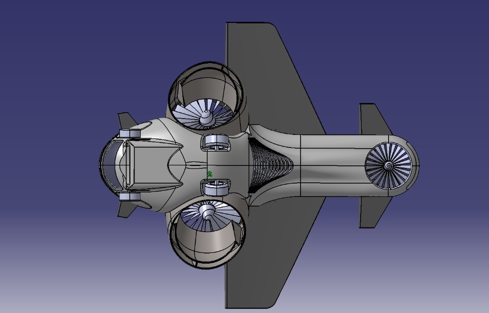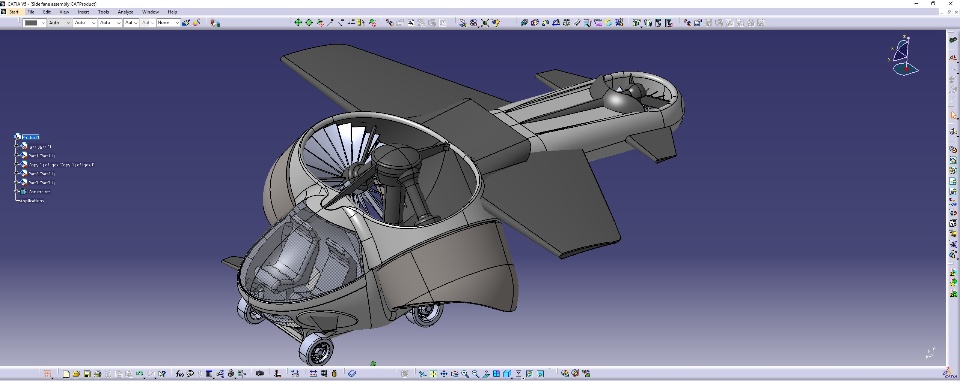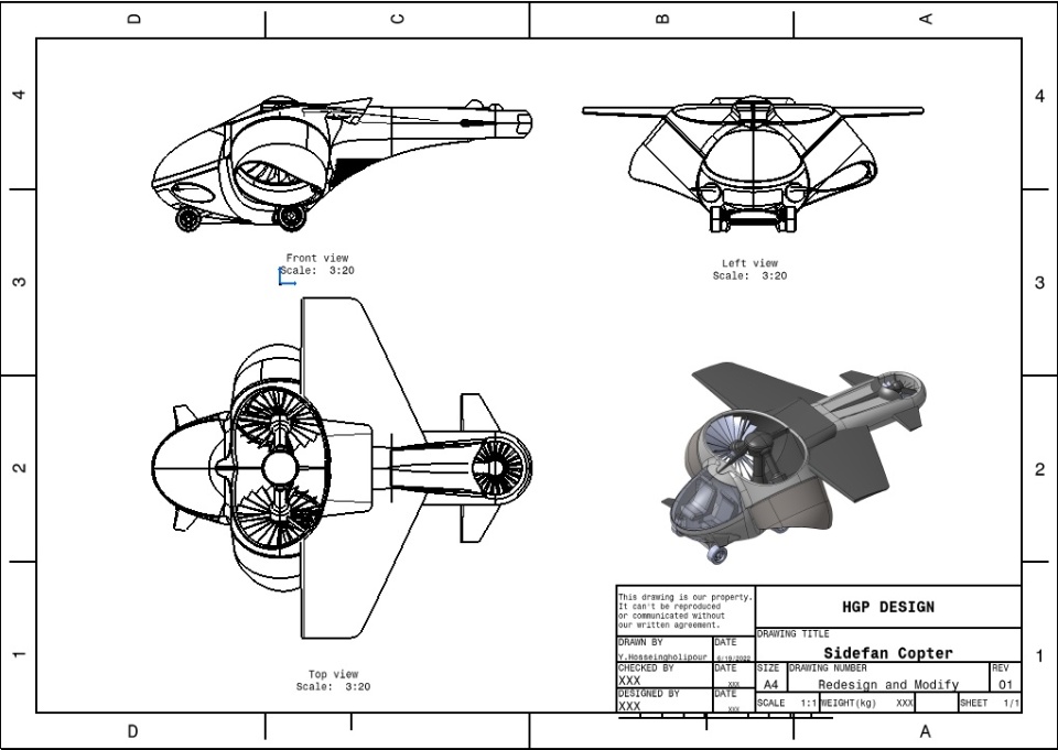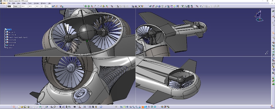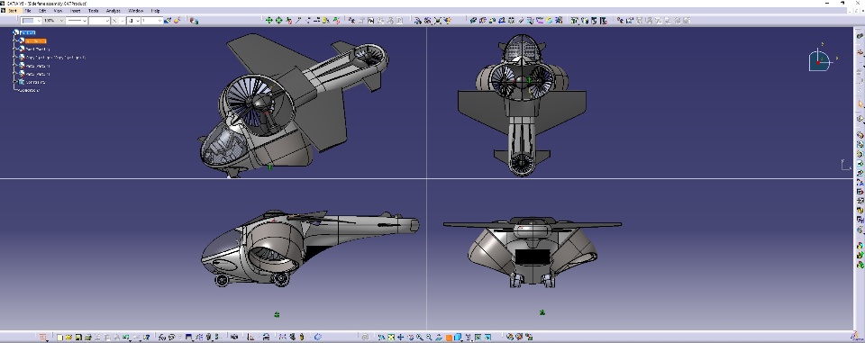 Redesigning and modifying a helicopter with side fans (In Catia software), in fact, this is a type of quadcopter with the capabilities of a helicopter that, unlike a helicopter that has a blade and uses the eject button in emergencies that are dangerous for the pilot. In this model, two very strong fans are used on the sides and one fan is used in the tail, which adjusts the movements to the left and right by rotating the sides of the fan and changing the direction of the output winds. However, in this model, two small fins Used in the center and tail, which is used to keep the helicopter stable. The main changes are in the air outlet of the fans in the back of the cabin (inlet air from the front and outlet from the rear) and the installation of the frame for the rear fan, as well as the central wings and the tail and front of the cabin.
