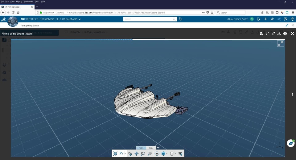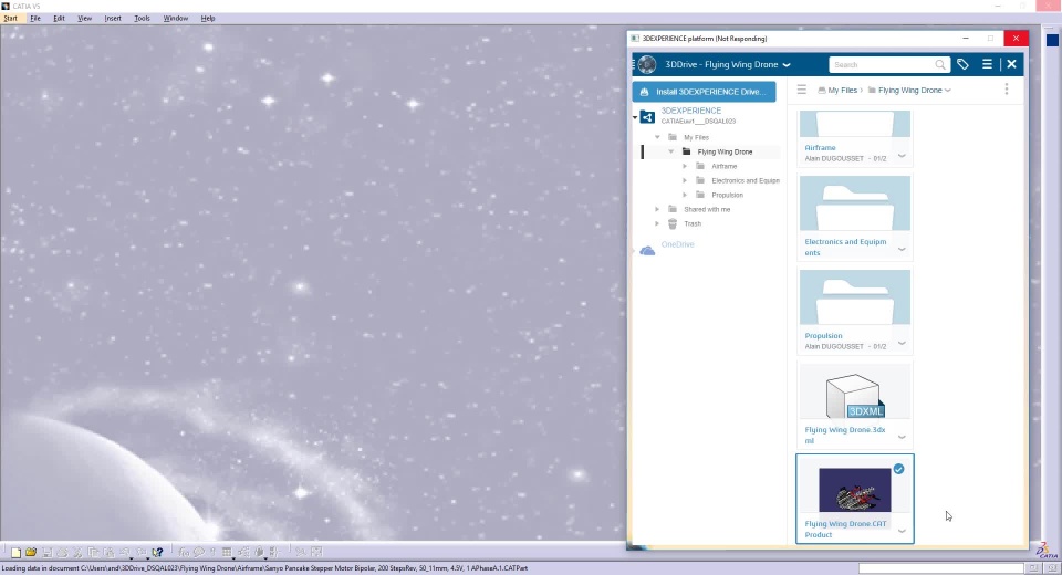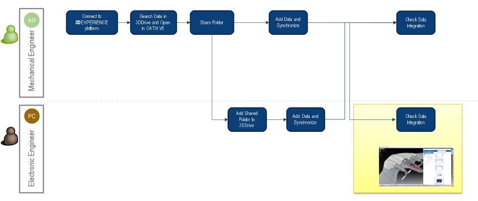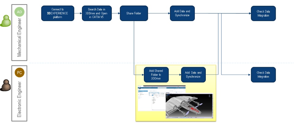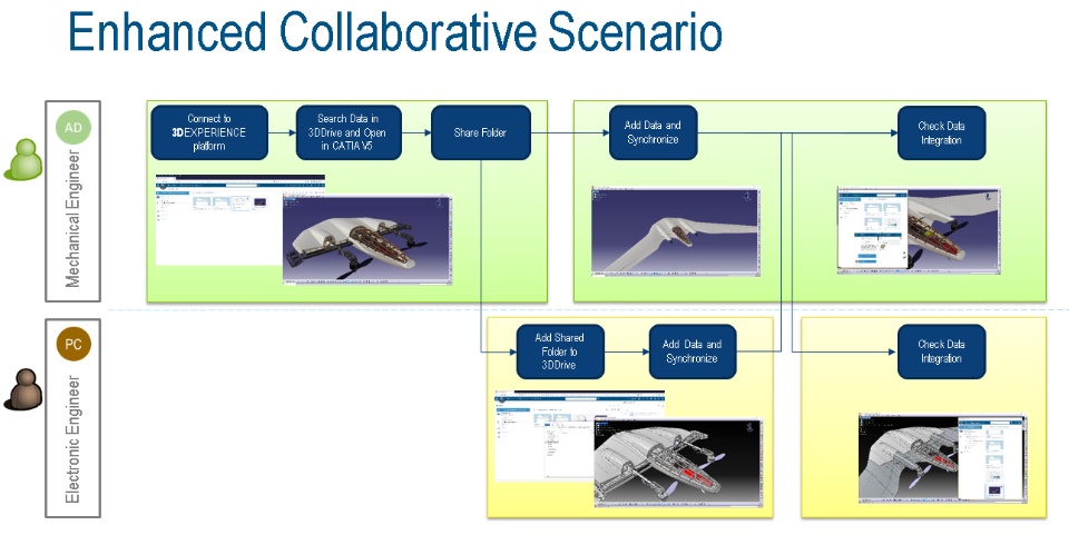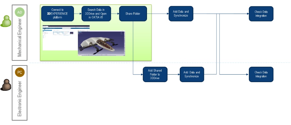 Going into some details, in a first step, a Mechanical Engineer (AD), connected to the 3DEXPERIENCE platform and working on a new flying wing drone, share a folder with one of his colleague, an Electronic Engineer (PC).