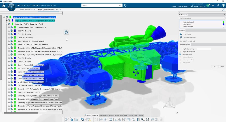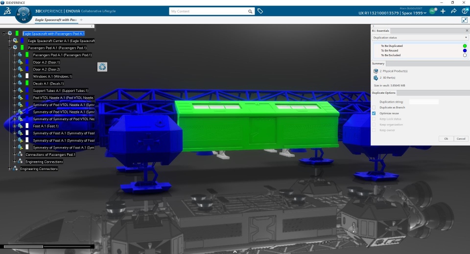 First of all, the advanced duplicate function available in ENOVIA Collaborative Lifecycle App is very useful to create new data which can be then enhanced for a new variant of my spaceship.