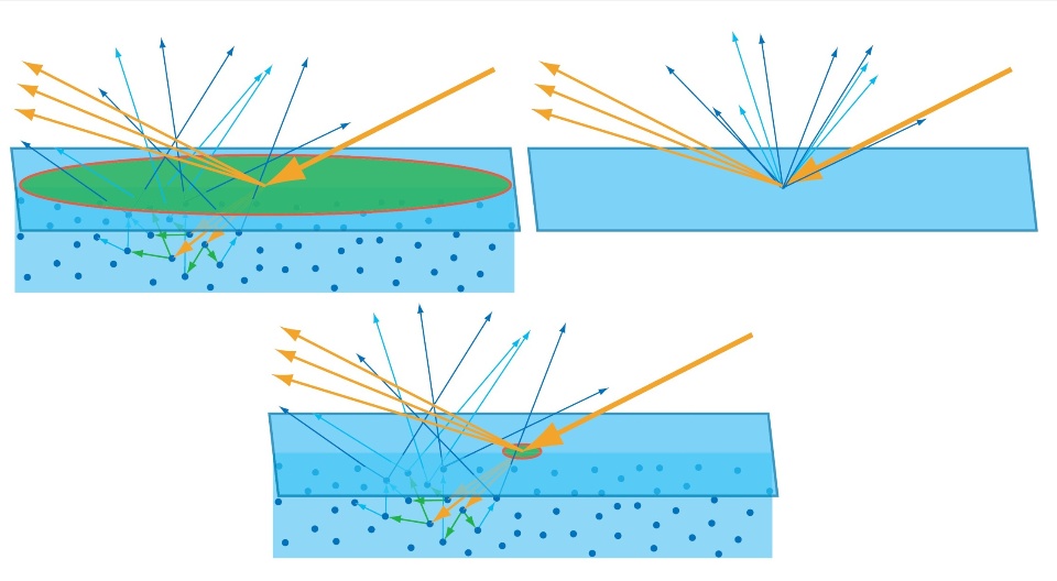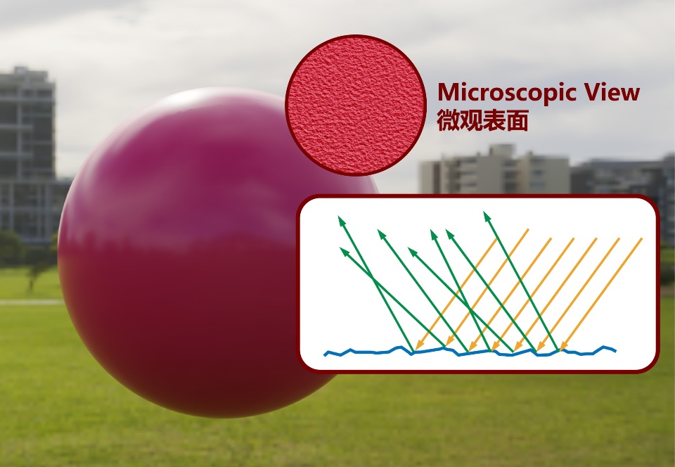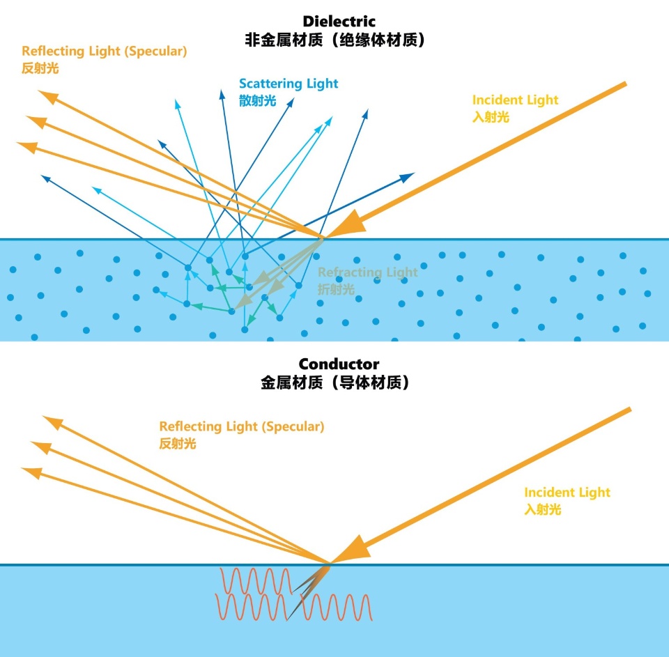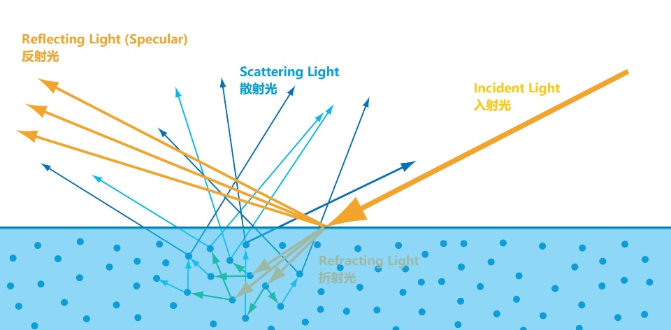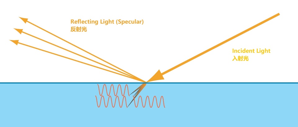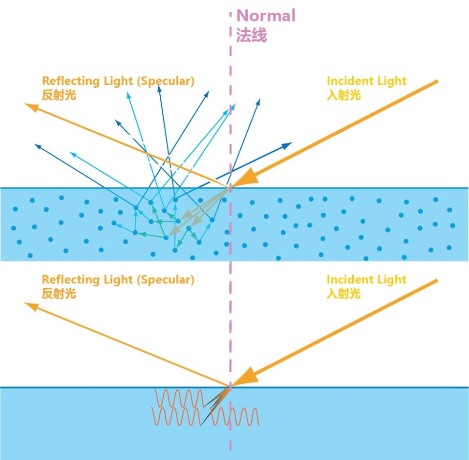 This picture shows how lights interact with non-metallic surfaces. We can see from the figure that the light reflected directly by the surface is called Specular. We note that in addition to Specular light which directly reflected by the surface, the other part of the light refracted enters the object, absorbed by the particles narrowly beneath the surface, and the rest are scattered out of the surface in all directions.