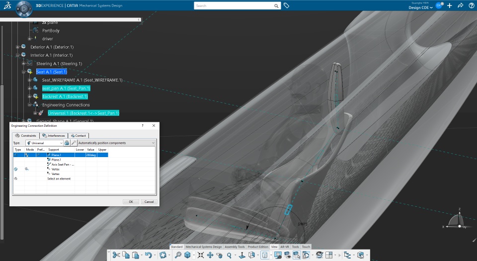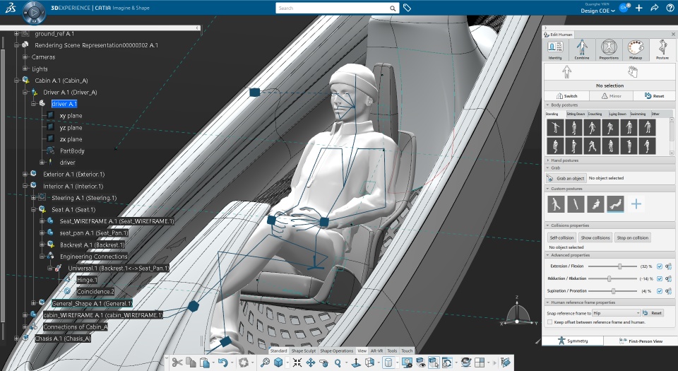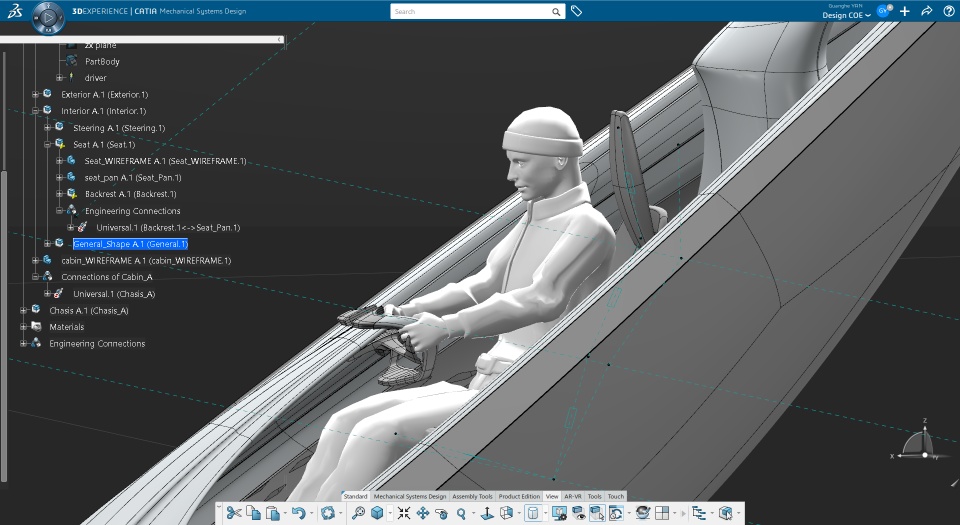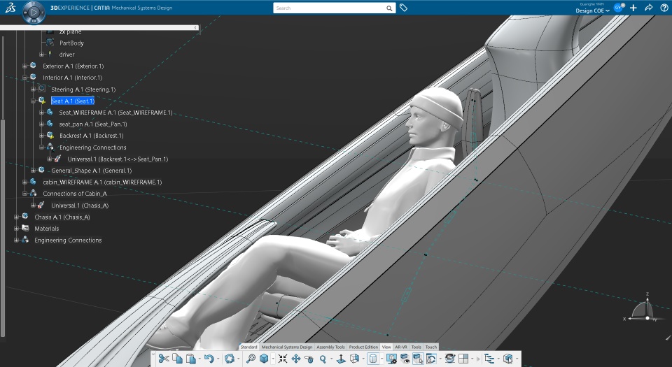 In the design of vehicles, ergonomics is also an important factor. With the help of Human Design, we can also store the different actions and postures of passengers/drivers. Focusing on human behavior, designers can ensure that the design of the vehicle can meet the various needs of the driver/passenger. Cooperating with the Mechanical Sys. Design and Assembly Design, we are also able to design how the parts in the car match the actions of the person. Following pictures shows how the seat fit the driver's actions: