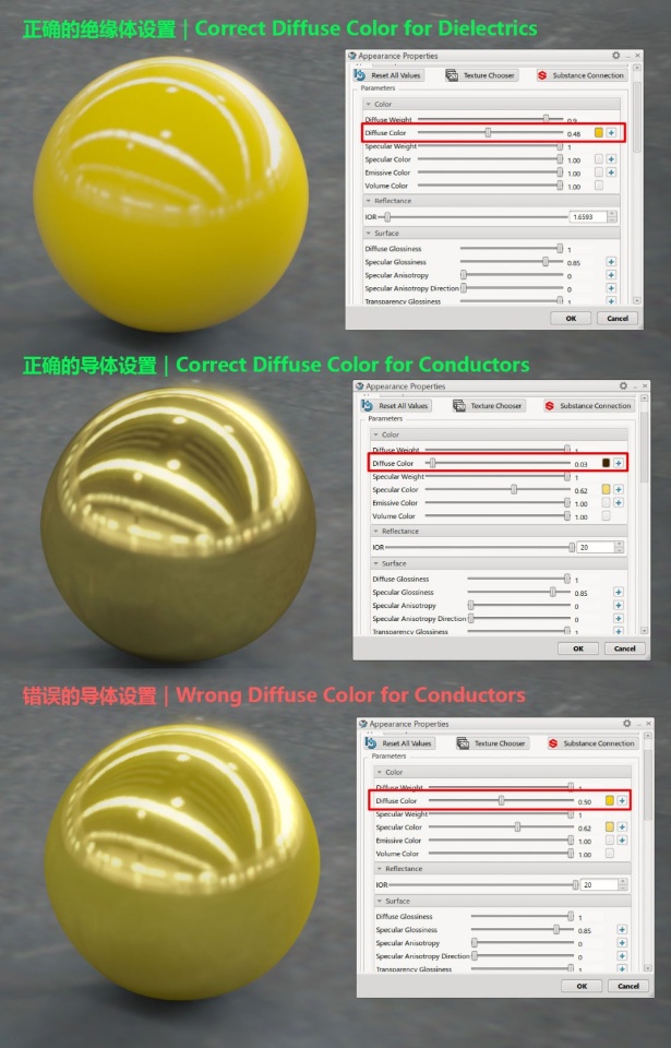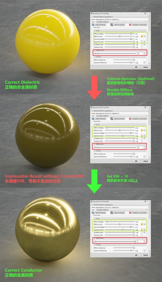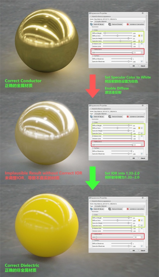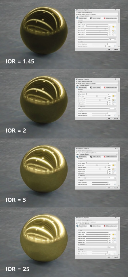 In order to convert a material between metal and non-metal, in addition to the parameters of Diffuse Color, Diffuse Weight, Specular Color and Specular Weight mentioned earlier, there is a vital parameter to adjust — Index of Refraction (later called IOR). The IOR of non-metals should often be set relatively lower (about 1.33 to 2.0, a few materials, such as gems, have an IOR of 2.0 +), while metal materials tend to be very high (practically higher than 10, although in real-world the IOR of metal is a complex number).