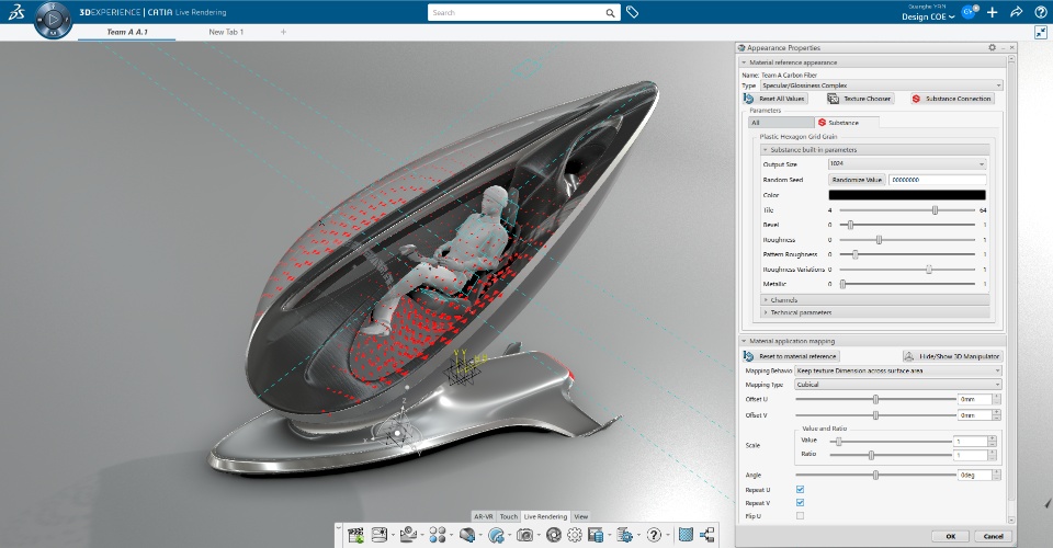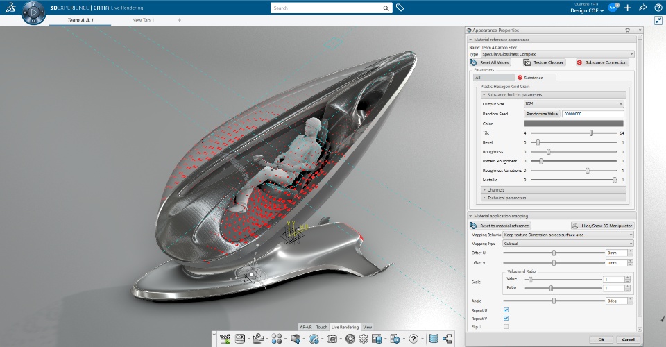 Once again, we use the Create Appearance Data from Substance command to import Substance materials. This time we continue to explore the possibility of Substance materials by creating a carbon fiber material for the interior.
