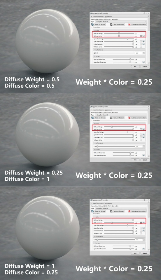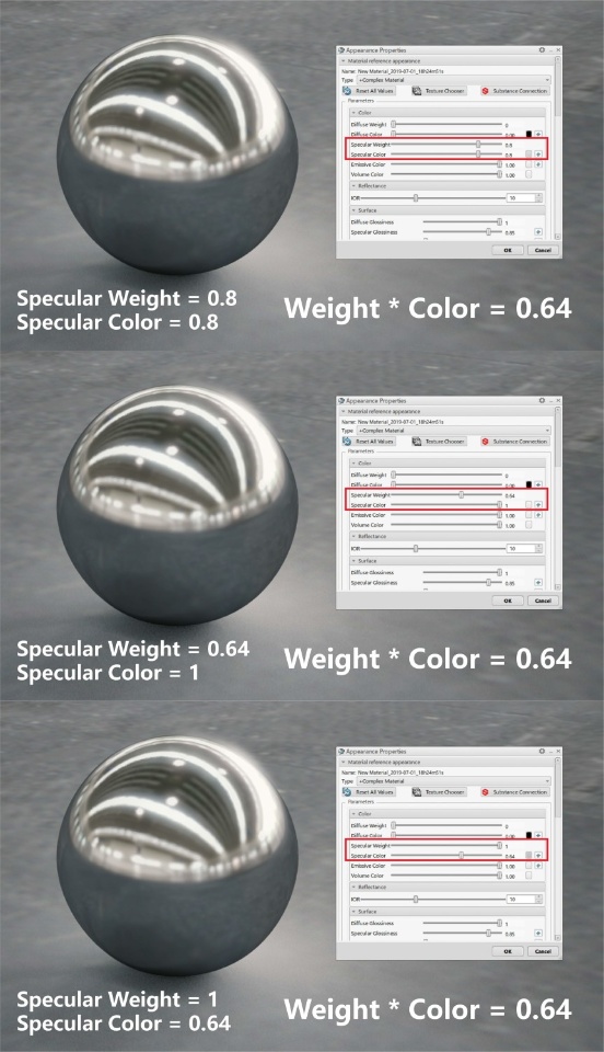As you can see, as long as the product of Specular Color and Specular Weight remains the same, the final effect will not change. if you want to verify accurately, you can try to set the blend mode to difference in Photoshop as we experimented with IOR before to see if the result is pure black. Similarly, for Diffuse Color and Diffuse Weight, as long as the product of the two remains the same, the final effect becomes the same. Take a look at the figure below: