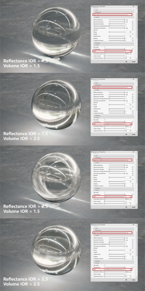 Similarly, if you want to get physically correct results, the IOR in Reflectance should be consistent with the IOR in Volume (reflecting IOR and refracting IOR), as shown in the figure: