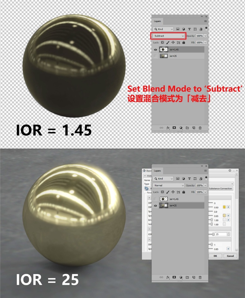 Here, taking the rendered map of IOR=25 as the base map (notice the layer panel), we extract the spheres of different IOR separately and place them on them (in this case, IOR=1.45 as an example), and then change the blending mode to "subtract". As the name implies, this hybrid pattern is used to calculate the difference value of each pixel between the upper and lower layers. The methods are as follows: