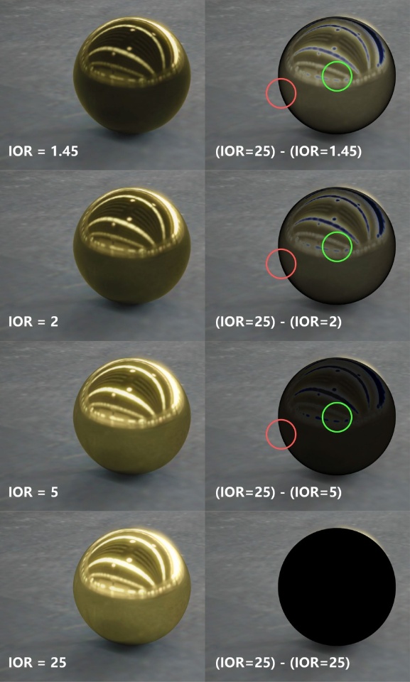 The last row of spheres is pure black, which is quite natural as it shows the difference between the sphere of IOR=25 and the base map (whose IOR is also 25).