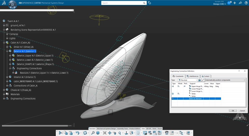 The following two figures show the two modes of SEC-X. Through Mechanical Sys. Design, Assembly Design, and other modules, with the help of CATIA structure tree, can rotate the upper cabin together with everything inside simultaneously, without any additional operation. At the same time, the upper and lower limits of rotation degree can also be designated to switch accurately between the two modes, helping ensure the compatibility of multiple modes.