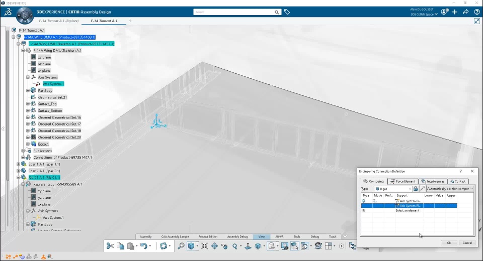 (for instance Mechanical Spars and/or Ribs driven by a Wing Skeleton, as seen in my first post) can of course be positioned thanks to CATIA Assembly Design Engineering Connections. In this case, when using links, the shape of a Part (one Rib in the following video) depends on its position.Assembly features can also be created: for instances here an assembly cut based on geometries and parameters defined in a skeleton and impacting several instances of mechanical parts.