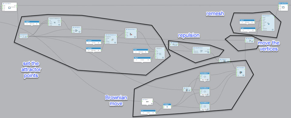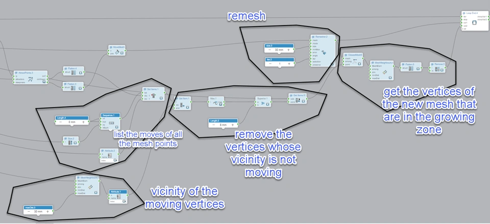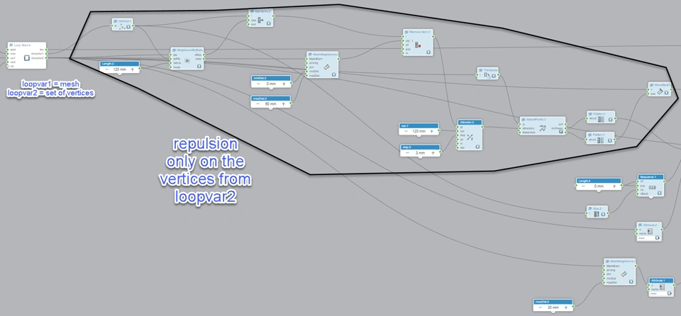 here you can see the repulsion is only on the loopvar2 vertices. they are the "growing zone" of the mesh. the rest of vertices will not move.