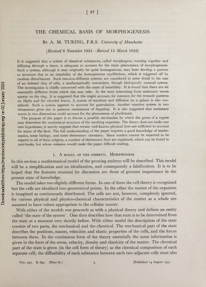 "It is suggested that a system of chemical substances, called morphogens, reacting together and diffusing through a tissue, is adequate to account for the main phenomena of morphogenesis."