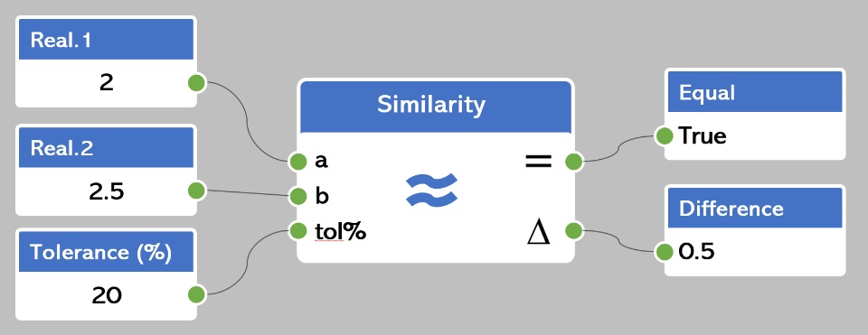 The Similarity custom node evaluates two inputs and tests for similarity between two numbers (reals). It also has a percentage input that defines the ratio of input A that input B is allowed to deviate from before inequality is assumed. The Similarity custom node also has an output that determines the absolute value distance between the two inputs.