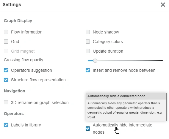 The new option Automatically hide intermediate nodes hides an input geometry when it is used to create another geometry, provided that the output geometry has the same dimension or higher. A setting is available to deactivate this behavior (if needed).