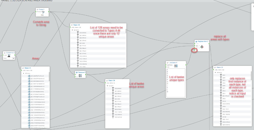 Hello, Does anyone else have any issues with the replace item node? I would like to tag a series of panels based on their size. I know geometrically that they all are one of twelve sizes, so I should be able to simply do a replace on their area for a letter to tag them. Instead of replacing the entire list the node replaces the first instance of each size. Note that I do have the dimension on the inputs set to 1, and the All input toggle to on.