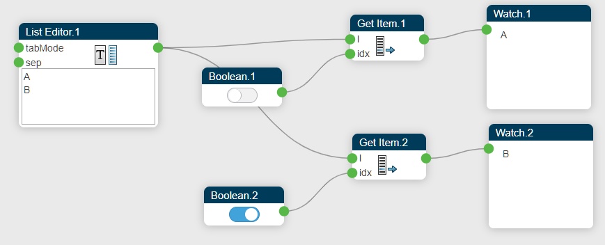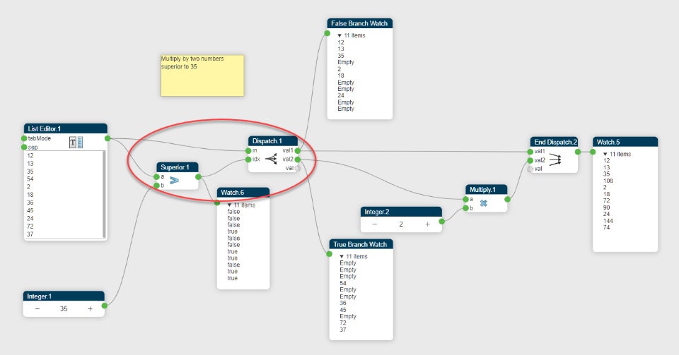 This conversion is very useful to add conditional treatments. Boolean are produced by testing a condition (for example, is a number superior to another one) and consumed by Get Item, Select or Dispatch operators.