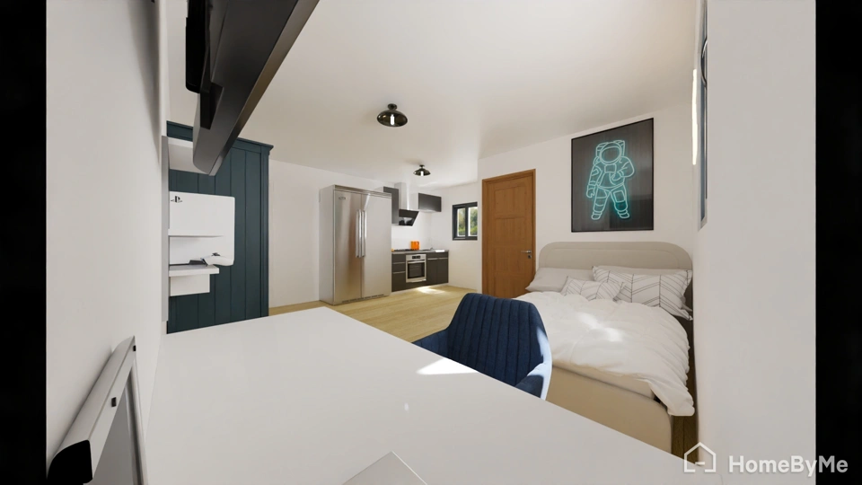 I speak french only sorry. Je vous présenteun petit projet d’une chambre américaine (avec coin cuisine). Dimension  5m/5 donc 25m2.