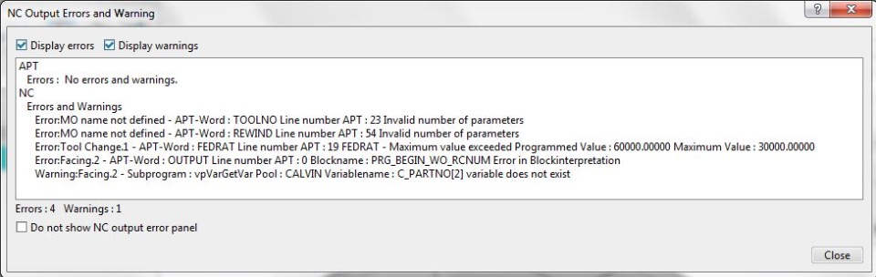 Hi all, fairly new user here. I am encountering some errors while trying to generate an NC file and would like some advice. The first error is that at the line TOOLNO in the APTsource file, the tool information is not registered in the PP Instruction, even though I have already configured the appropriate parameters. I have followed the exact same tool conditions as a sample PPR file given by my distributor, whose file works without warnings nor errors using the same PP file.