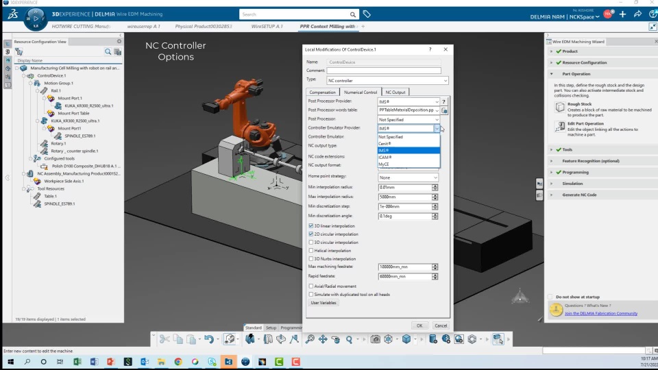 Its not new that , Multi-Axis Machining supports Robotic machining. But how do we swap between a NC controller output to a Robot Controller output ? This video shows how to swap. There are over 1500 Robots in DELMIA's library that can be used for similar applications .