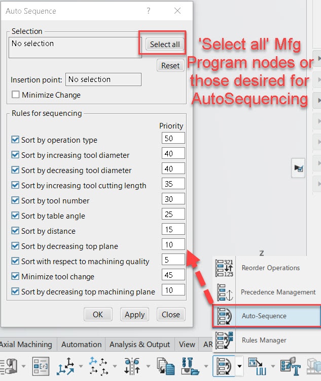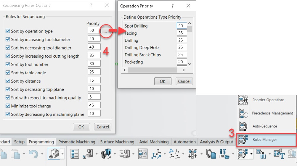 This is used to automatically reduce tool changes and consolidate machining operations that use same tools. This capability gives you the ability to choose your options and set priorities when the rules are applied. Below are few images that illustrates how to set this up and apply to your process.