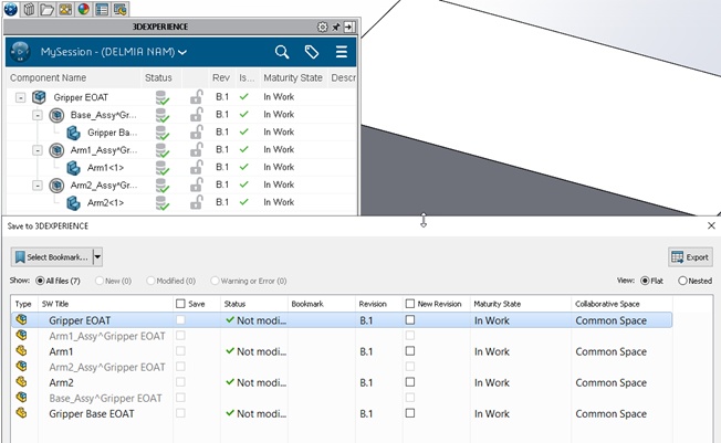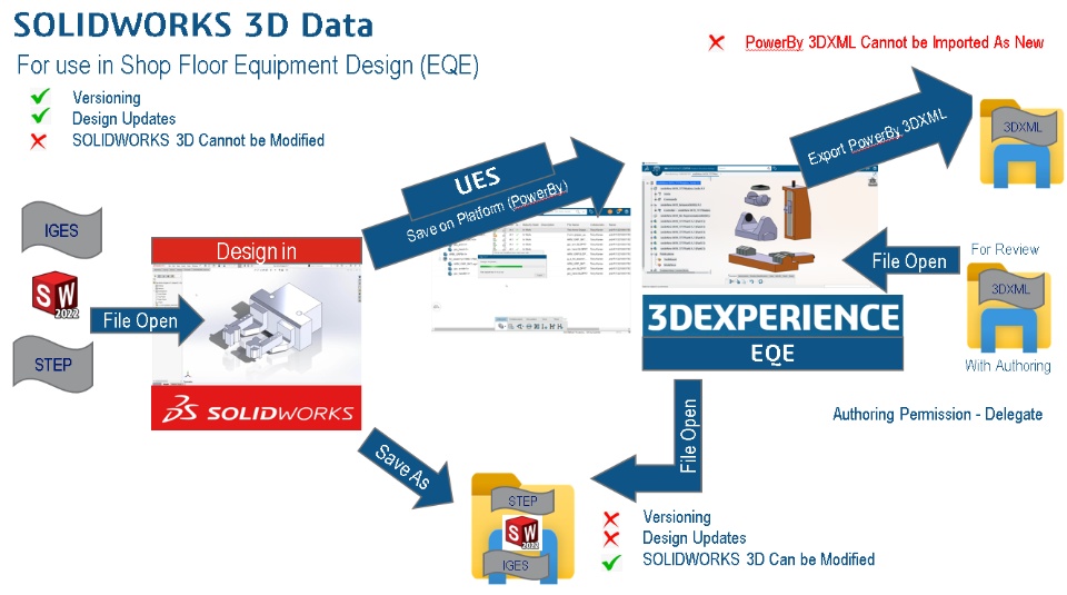 When you have 3D data created or imported in SOLIDWORKS, of course you can save it to a file. If you are also using a 3DEXPERIENCE Works product, such as Shop Floor Programmer (NSR), and its application Shop Floor Equipment Design, you have additional functionality that can save the 3D data from SOLIDWORKS onto the 3DEXPERIENCE platform called PowerBy. When using this method, it comes along with certain rules in order to provide the proper level of digital continuity between the CAD Creator or CAD Master, and the manufacturing user in Shop Floor Equipment Engineer (EQE). PowerBy provides for the versioning of 3D data as well as the history and vaulting of the data. When the design data is saved from SOLIDWORKS to the 3DEXPERIENCE platform using PowerBy (seen below), part of the CAD data cannot be modified in EQE. That is because the EQE user is not the CAD Master of the 3D data. This restriction ensures that the design part is not compromised by being modified by a user outside of the design workflow, and the outside user cannot break any of the inherent links to the CAD data implemented by the PowerBy functionality.