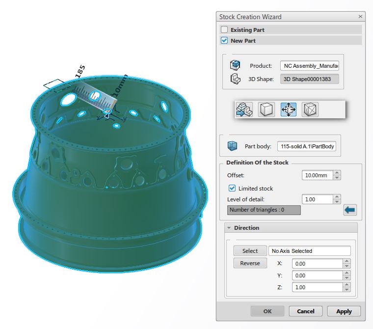Hi, would like to know which axis to specify the projection of stock, in the case where I have an irregular shape which is hollow in the middle? I have tried a few different combinations of the parameters but can't seem to get what I want, which is a 2mm casting stock in all faces. The results I get usually fills up the entire void in the center of the component.