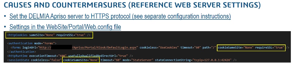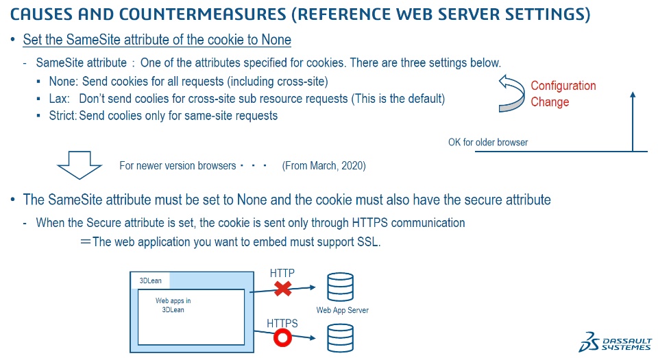 If you try to embed DELMIA Apriso screens in 3DLean, you should be able to see the Apriso login screen. However, when you try to log in by using an Apriso user, the login process may fail and the page is reloading and looping back to log in page. This issue is caused by cookie's cross origin restriction (Apriso cookie is blocked) by newer version of browser like Chrome, Edge and Firefox.