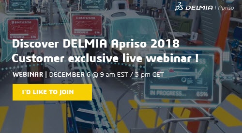 Want to learn more about DELMIA Apriso? Discover DELMIA Apriso 2018 in our customer-exclusive live webinar on Wednesday December 6th at 9 a.m. (EST). The newest release offers several significant enhancements that work to address your current and ongoing needs in manufacturing operations management. It also supports your path toward Digital Continuity. Don’t miss this opportunity to learn about DELMIA Apriso 2018. Register today! https://attendee.gotowebinar.com/register/2246951354045853186?source=DELMIA+Communities