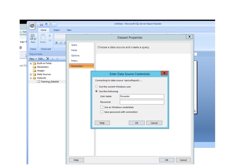 I am working on report builder session ( REP001). When I try to create and enter Parameters.It is asking me to connect to the data source. Please see screenshot, Also I try using current Window user, but it won’t let me connect. Please provide password.