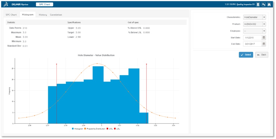 DELMIA Apriso Statistical Process Control (SPC) enables manufacturers to embed actionable control charts into the process on the shopfloor. Alerts can be generated when a process starts to trend out of control. Statistical analysis can be conducted to help reduce process variability resulting in reduced fewer failures, reduced NVA and improved overall product quality.