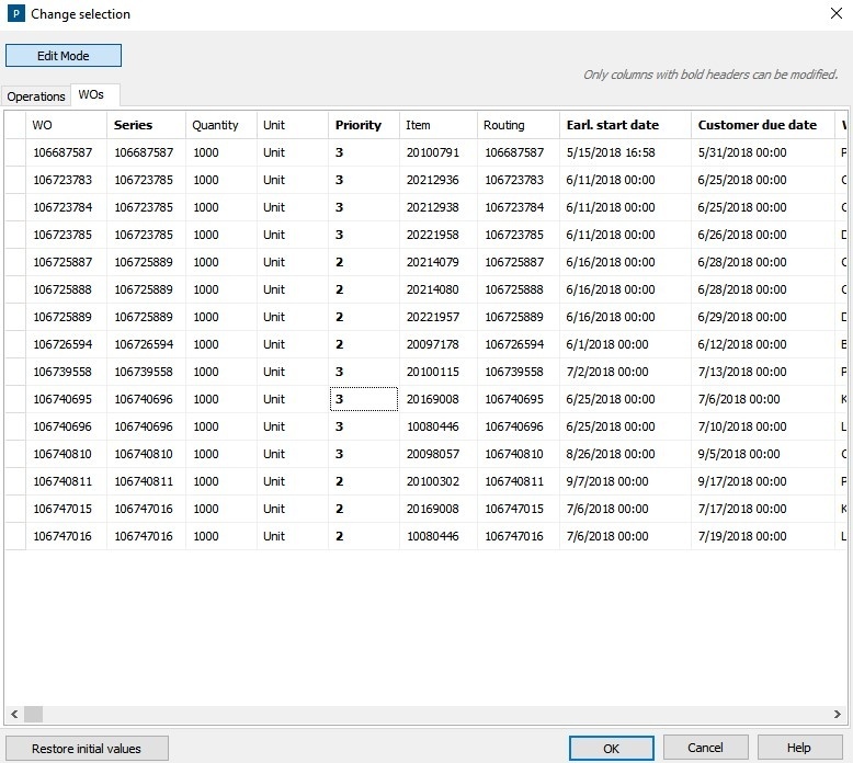 - Individually (the Edit Mode must be selected) by manually setting new values in the modifiable columns (titled in bold) within either the Operations or WOs tabs. Selecting the Edit Mode will hide the fields displayed below the list of Operations or WOs. In the example below the Priority of the filtered WOs have each been modified individually.