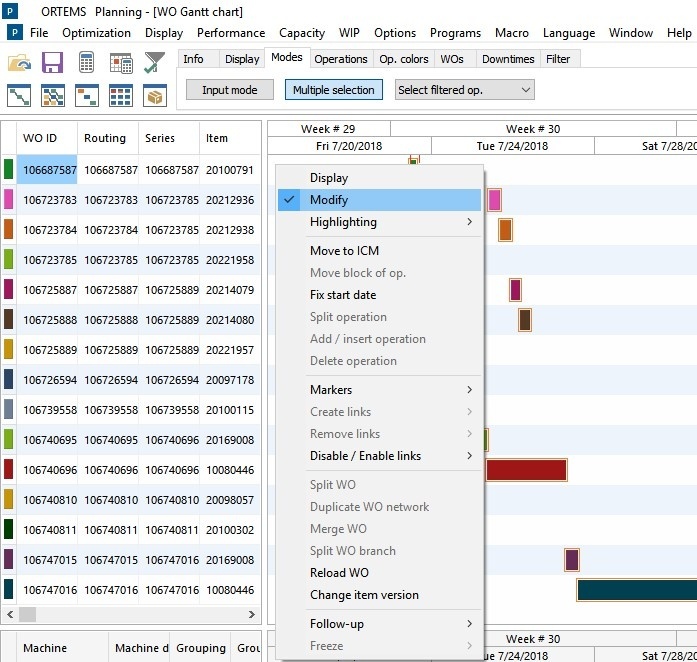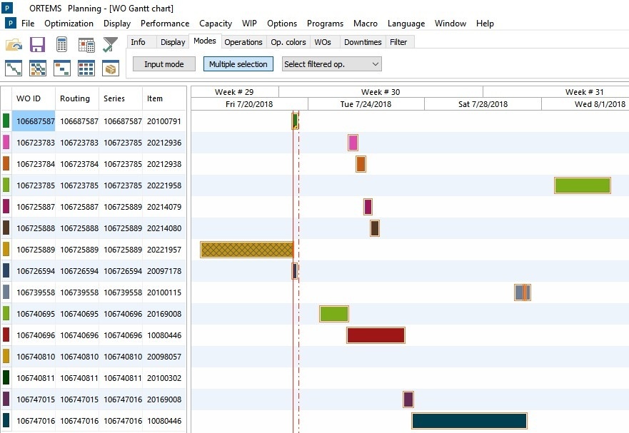 Within the Agile Manufacturing domain, the DELMIA Ortems Planning module provides a useful and efficient functionality known as Mass Modifications. There is a Modes tab on the control ribbon of every Gantt chart within the Planning that enables the planner to concurrently update or modify large numbers of Operations or Work Orders (WOs).