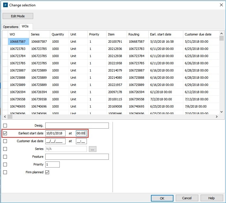 - Globally (the default, with the Edit Mode button deselected) by changing the values in the fields displayed below the list of Operations or WOs. For example, the Earliest Start Date field has been selected on the WO tab and can therefore be modified for all of the filtered WO’s.