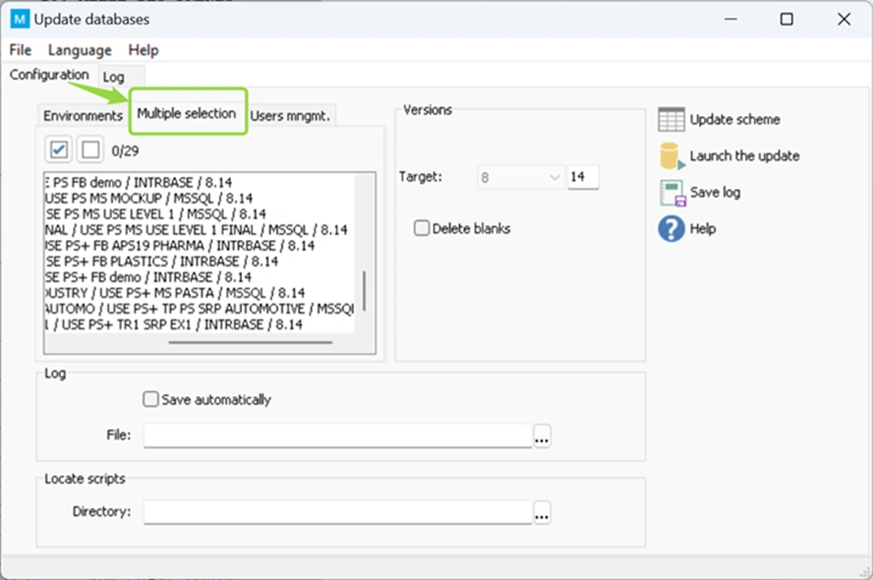 The database type and source version are precised on each end of line. Hence you can select the environments to update according to their database version. The selected databases types can be mixed (Firebird, ORACLE and MSSQL).